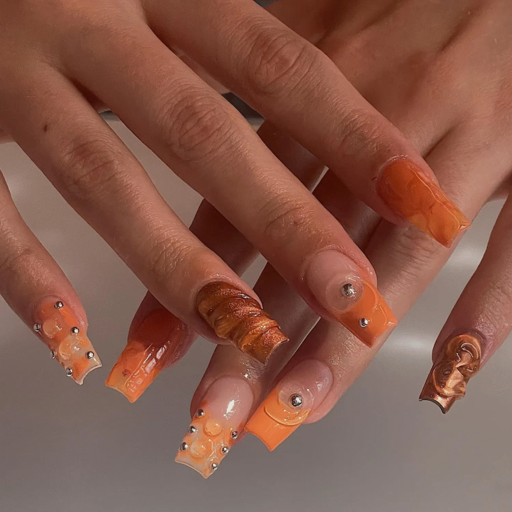 With Taylor Swift’s Life of a Showgirl album release this October, these glittery and glossy orange nails are a fun, festive way to celebrate. The orange chrome finish sparkles with a vibrant, glamorous feel—ideal for a show-stopping October look.