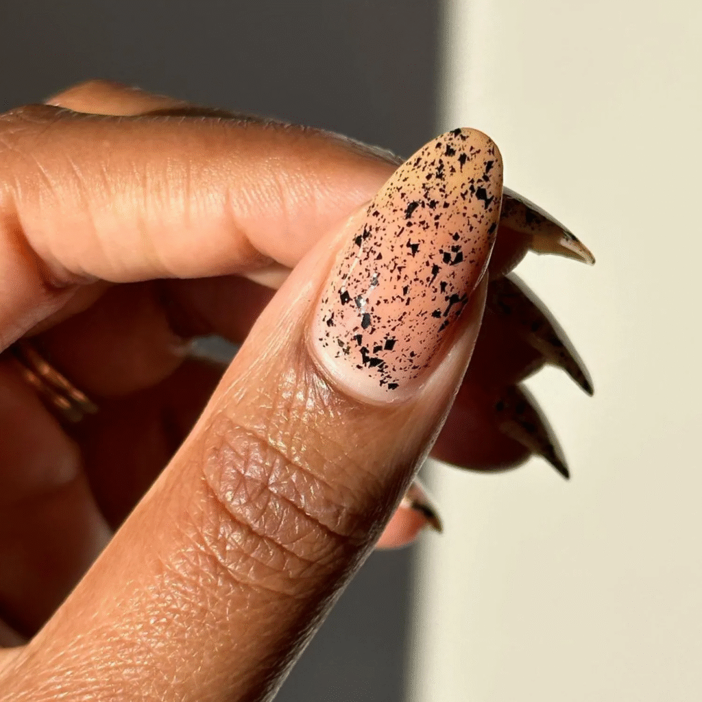 Short on time but still want a Halloween-themed design? Black speckled nails are easy to achieve with a toothbrush and black polish. Flick the black polish over a peach base for a fun and quick Halloween manicure.