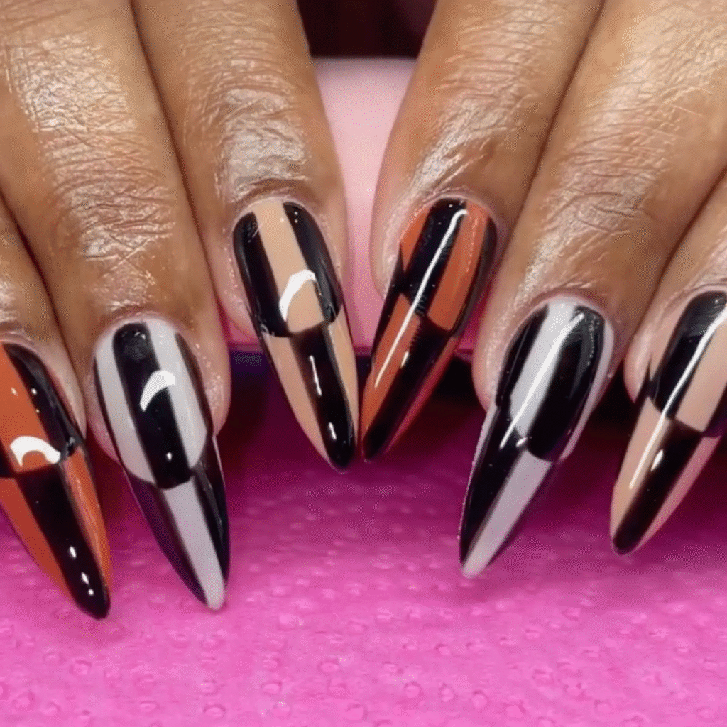 Checkerboard nails in autumn hues like rust, taupe, and ivory are a fun and chic way to embrace fall. The bold pattern paired with these fall-inspired colors gives a nod to The Nightmare Before Christmas, making them perfect for Halloween.