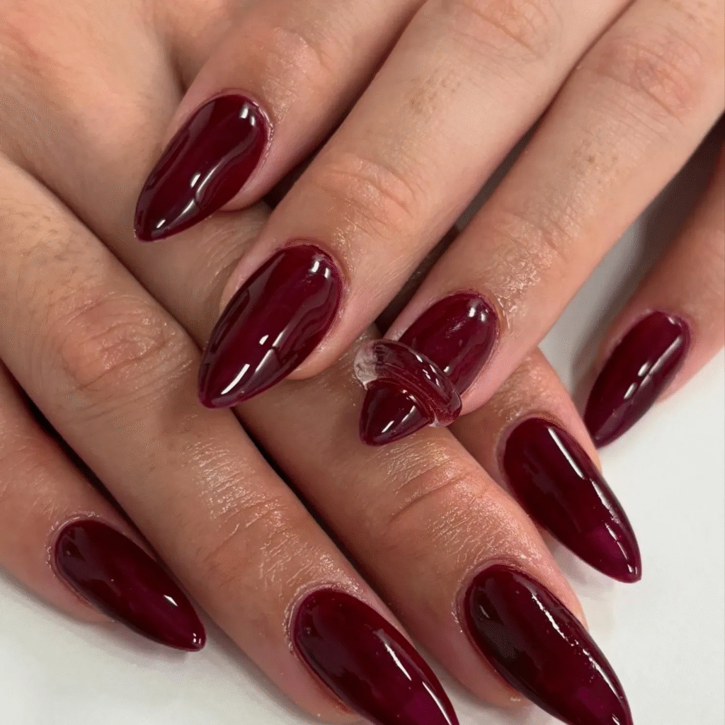 For a more elegant and mysterious look, deep maroon nails are a great choice. This rich, dark red color complements everything from cozy fall outfits to a night out. The addition of 3D gel art on the ring finger makes this design extra unique.