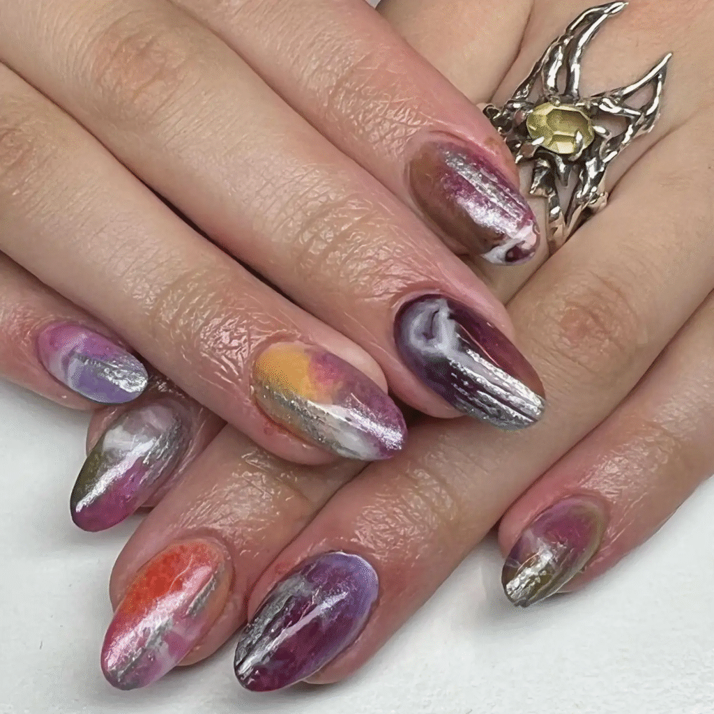 Watercolor nails are often seen in spring, but the moody undertones of an autumnal watercolor design make it perfect for October. Blend colors like purple, yellow, orange, and orchid for a blurred, beautiful look that transitions seamlessly into fall.