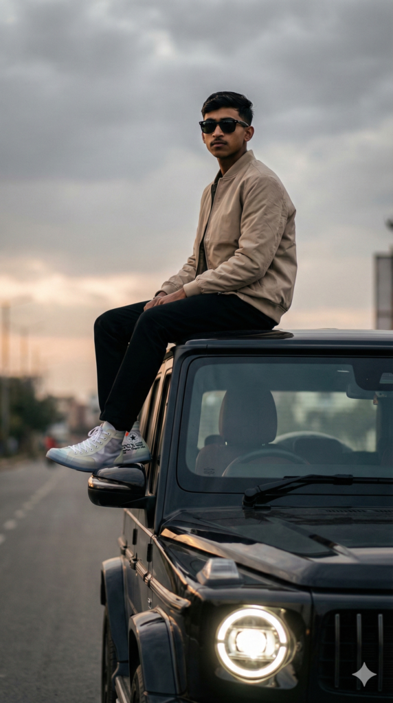 Copy This Prompt: “Subject based on the reference image. Exact facial features; Hyperrealistic 8K editorial style with a cinematic sunset atmosphere; Man sitting sideways on the roof of a black Mercedes-AMG G63, one leg bent with his foot resting on the hood, head slightly turned looking at the camera with striking presence; outfit: beige bomber jacket with front zipper, modern-cut black pants, CONVERSE x OFF-WHITE Chuck Taylor Vulcanized Hi “Clear” sneakers, Ray-Ban Wayfarer sunglasses; casual, sophisticated, urban and modern style with an editorial touch; Urban setting, background with cloudy gray sky; Soft warm sunset lighting, car headlights turned on softly illuminating and creating dramatic depth; hype realistic 8K portrait, 24mm f/1.2 lens, shallow depth of field, softly blurred background, absolute focus on skin, hair, clothing and car material textures, natural lighting combined with headlights, warm tones and soft contrast. Aspect Ratio 9:16 Vertical.”