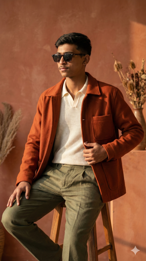 Copy This Prompt: “Ultra-realistic high-resolution fashion portrait of the exact same me from the reference image, maintaining his specific facial features, beard style, and same hairstyle. He is wearing dark sunglasses. He is seated on a simple wooden stool in a warm studio, body turned slightly to the side. One hand rests casually on his knee while the other lightly holds the edge of his jacket near the chest. He is wearing a burnt orange wool chore jacket over a cream knitted silk polo shirt, paired with olive green pleated linen trousers. The background features a textured terracotta wall and dried botanical elements in a ceramic vase. Warm, soft lighting like late afternoon sunlight. Shot on an 85mm lens, f/1.8, shallow depth of field, sharp subject focus, cinematic luxury fashion editorial look. Aspect Ratio 9:16 Vertical.”