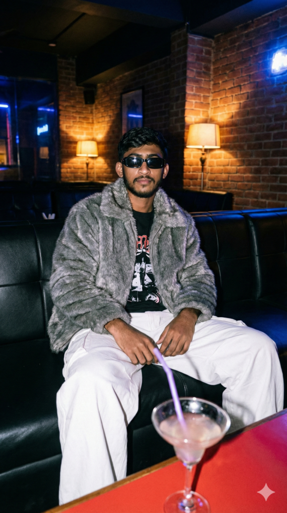 Copy This Prompt: “Ultra-realistic flash-photography portrait of the man from the provided image. He has the same face, same beard, and same hairstyle. He is seated in a relaxed sideways pose on a black leather sofa in a dimly lit bar. He is wearing a thick grey faux-fur jacket over a black graphic t-shirt and white oversized baggy trousers. He is wearing the same style of dark sunglasses. A harsh, direct on-camera flash illuminates his face and the fur jacket, highlighting skin texture and fabric details. Foreground: Blurred cocktail glass with a purple straw on a red tabletop. Background: Exposed brick walls, warm ambient lamp glow, and soft blue accent lighting. Raw, cinematic, Y2K underground nightlife aesthetic. Aspect Ratio 9:16 Vertical.”
