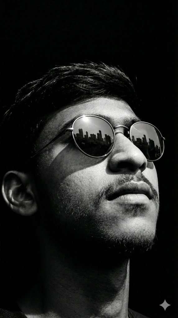 Copy This Prompt: “Dramatic, ultra-realistic close-up in black and white with high-contrast cinematic lighting from the side, highlighting the contours of his face and beard, casting deep shadows. He wears round, reflective sunglasses. He gazes confidently upward into a dark void. The sunglasses reflect a city’s towering skyline. The atmosphere is mysterious with a minimalist black background. Details in 4K. Keep the subject’s exact facial structure, hair texture, and the original photo. Aspect Ratio 9:16 Vertical.”