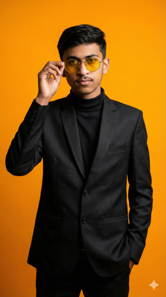 Copy This Prompt: “Studio photography of me in a black suit, black turtleneck and round sunglasses with translucent yellow lenses. Vibrant orange background. Unique poses from the front. Aspect Ratio 9:16 Vertical.”