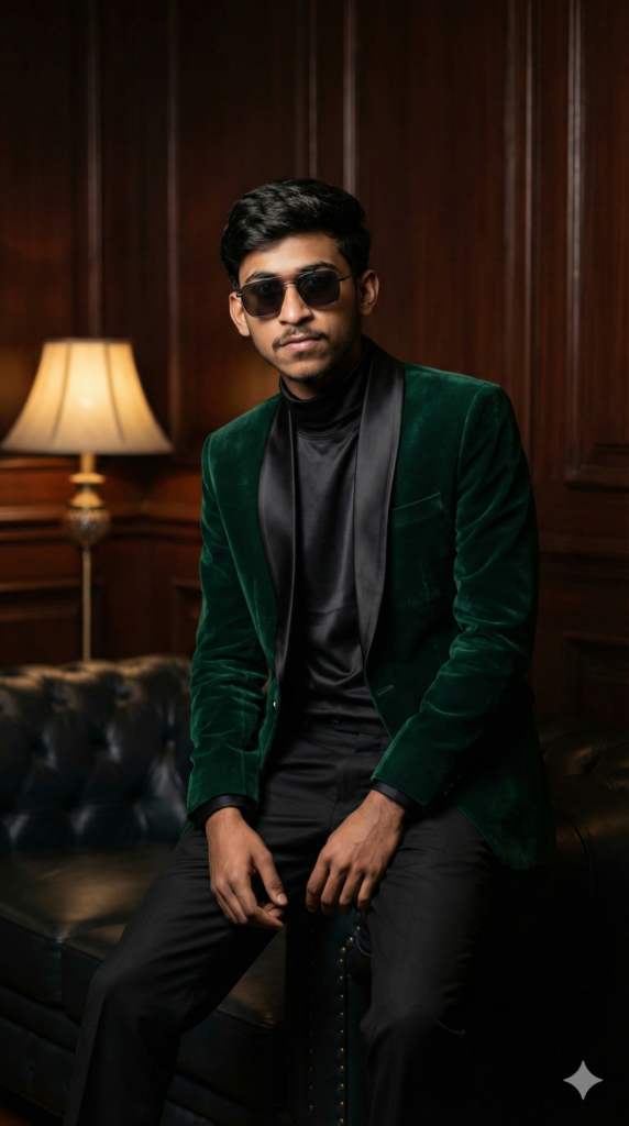 Copy This Prompt: “Ultra-realistic high-resolution fashion portrait. A charismatic young man posing elegantly in a dimly lit, high-end lounge setting. He is seated on the edge of a Chesterfield sofa, leaning forward slightly with elbows on his knees, hands clasped loosely together. He looks directly at the camera with a piercing, intense gaze. He is wearing a deep emerald green velvet tuxedo jacket with a black satin shawl collar, a black silk turtleneck underneath, and tailored black dress trousers. He is wearing sunglasses, highlighting his eyes. He has the same beard and same hairstyle. The setting is a luxurious room with dark mahogany wood paneling in the background and a hint of warm ambient light from a vintage lamp. Focused ‘Rembrandt lighting’ illuminates his face and the sheen of the velvet, creating a dramatic and expensive evening editorial look. Shot on 85mm lens, f/1.8. Mood: Confident, Bold, Luxury. Aspect Ratio 9:16 Vertical.”