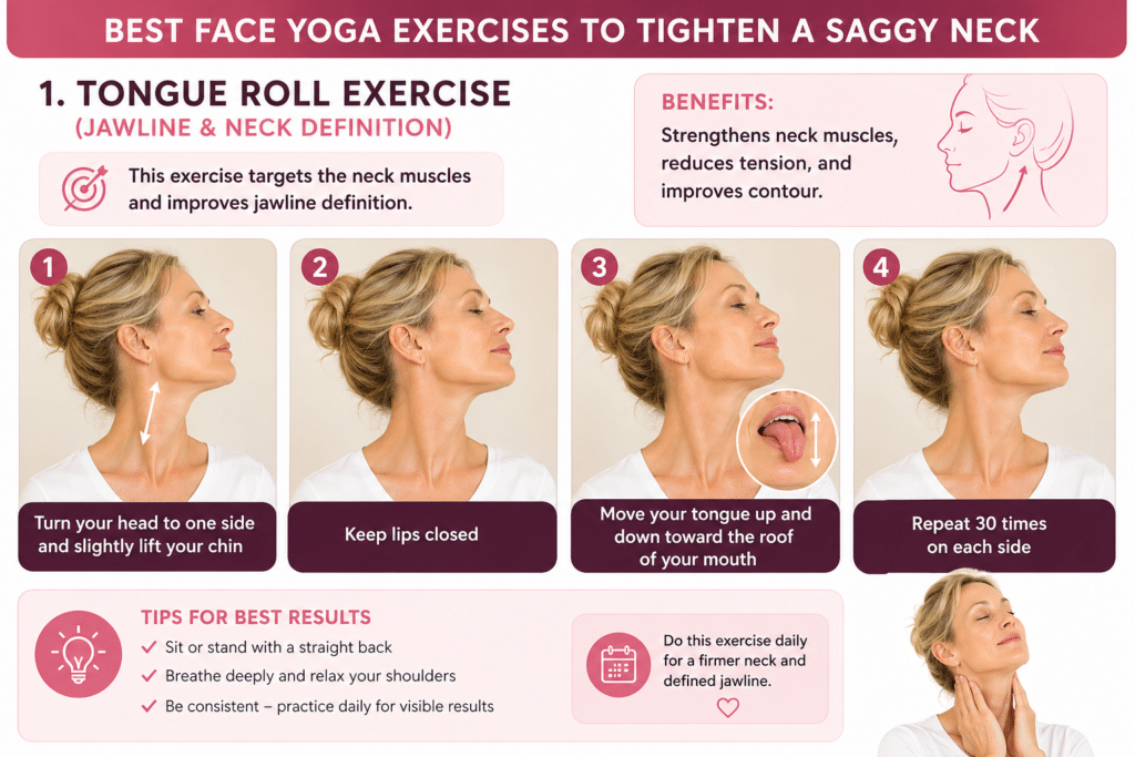 1. Tongue Roll Exercise (Jawline & Neck Definition)