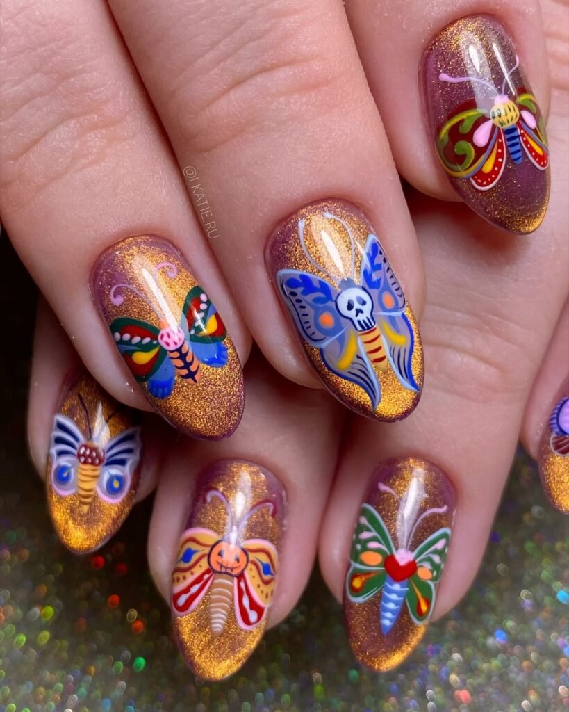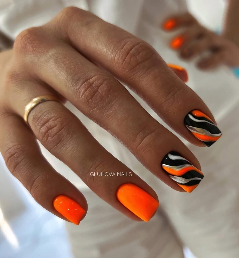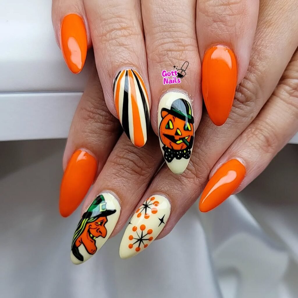 Nothing says Halloween more than pumpkins. A pumpkin spice nail design features warm orange, brown, and gold tones, perfect for the fall season. You can add tiny pumpkin designs or just use an orange polish for a solid base and add gold glitter for a magical touch. This design is chic, warm, and festive.