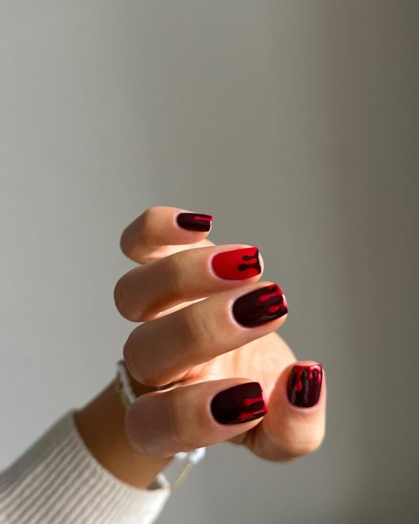 If you love the horror side of Halloween, bloody nails are a perfect choice. You can create a “bloody tips†effect by painting the tips of your nails with red polish and smudging it for a dripping effect. This design looks great with a black base coat, making it look like you’ve just escaped a horror movie. It’s spooky, stylish, and sure to turn heads.