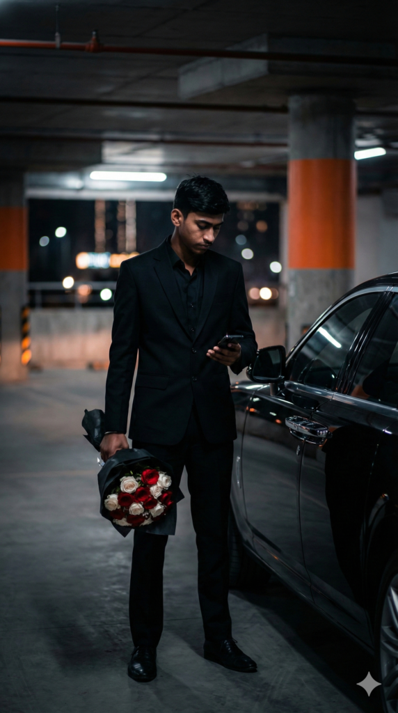 Prompt: An ultra-realistic cinematic photo of a handsome young Indian man standing in a dimly lit underground parking garage at night. The man has the exact facial features, sharp jawline, and same hairstyle of the person in the reference image. He is wearing a perfectly tailored all-black formal suit with a black shirt underneath, no tie. He has a serious, emotional expression, looking down while checking a smartphone in his right hand. In his left hand, he holds a bouquet of red and white roses wrapped in premium black paper. Beside him is a sleek, luxury black car. The background features parking pillars with orange accents and soft bokeh city lights visible through the entrance, creating a moody, romantic Valentine’s Day atmosphere with cinematic lighting and high-contrast shadows. Aspect Ratio Strictly 9:16 Vertical.