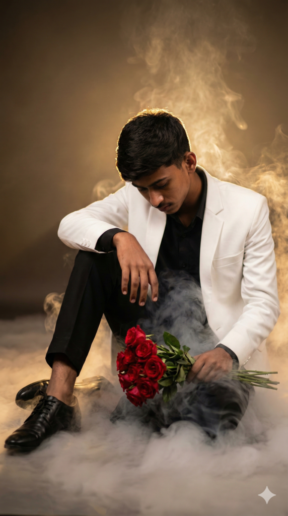 Prompt: Ultra-realistic 8K cinematic portrait of a stylish young man sitting on the floor in a dramatic studio setup. He wears a crisp white blazer, black shirt, black pants, and black formal shoes. He sits slightly leaned forward with his head bowed, one hand resting on his knee and the other hand holding a bouquet of fresh red roses. The entire ground is fully covered with thick white smoke/fog, swirling softly around his legs and roses. Warm golden backlight creates a glowing rim light on his hair and shoulders. Deep shadows, high contrast, emotional mood, dramatic atmosphere, soft bokeh background, premium cinematic lighting. Exactly same facial features. Take shot Partially Side angle. Aspect Ratio Strictly 9:16 Vertical.
