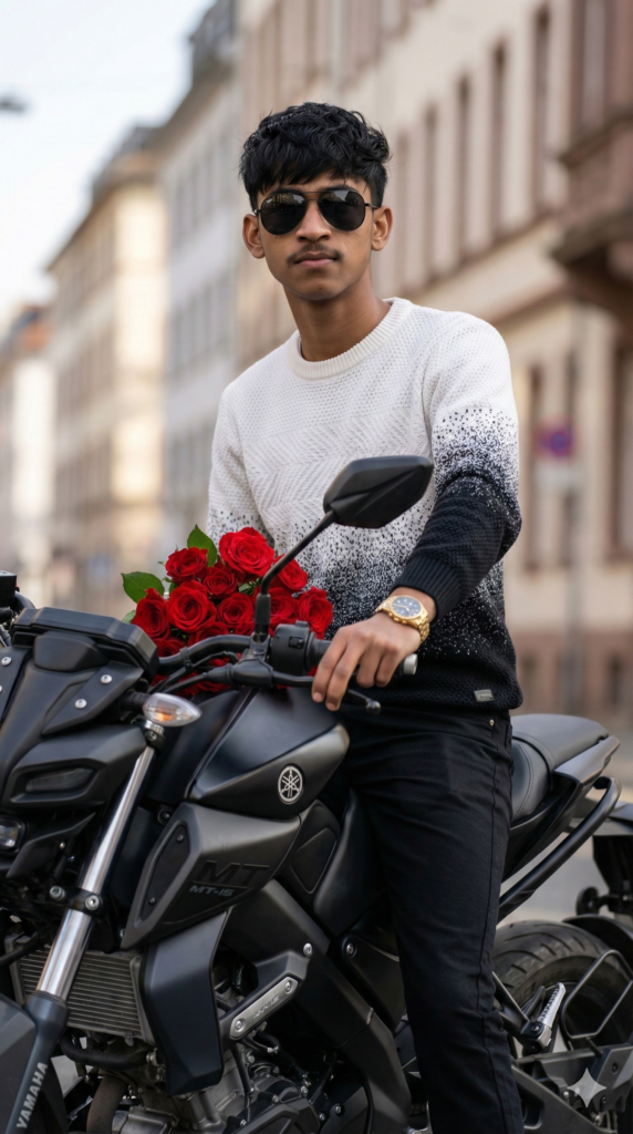 Prompt: Ultra-realistic 8K photo of a stylish young man sitting on a matte black Yamaha MT-15 bike on an urban road. He has the same hairstyle, same beard, sharp jawline, wearing a premium white knitted sweater with chest and black gradient texture on the sleeves (NO logo, NO text) and black slim-fit pants. Accessories: dark aviator sunglasses, gold wrist watch. Pose: sitting confidently on the bike, one hand on handle, looking directly at the camera. A bouquet of fresh red roses was placed on the bike’s fuel tank. Background softly blurred city street, daylight, clean luxury vibe. DSLR, 85mm lens, shallow depth of field, hyper-realistic, cinematic color grading, Instagram style. Exactly the same facial features. Aspect Ratio Strictly 9:16 Vertical.