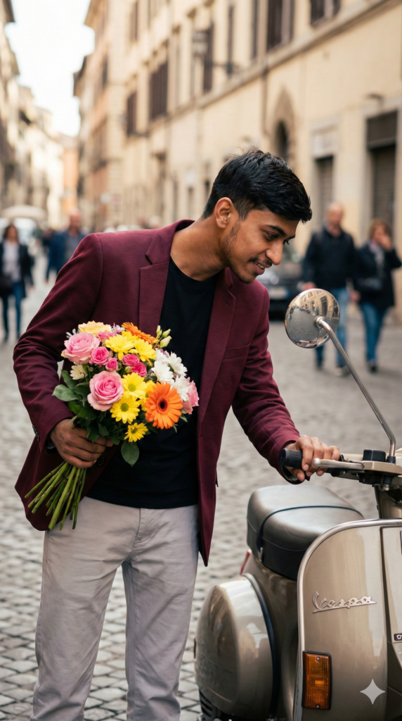 Prompt: Ultra-realistic cinematic street photography of a stylish young Indian man standing beside a classic vintage scooter on a European-style city street during daytime. The man is wearing a deep maroon/wine colored blazer, a black crew-neck t-shirt, and light grey fitted trousers. He has the same face, beard and hairstyle. He is holding a large colorful bouquet of fresh flowers (pink roses, yellow daisies, orange gerberas) in his left hand, close to his chest. With his right hand, he is slightly bent forward and adjusting or touching the scooter handle/mirror, looking down with a soft romantic smile. The background shows a soft blurred city street, beige buildings, and natural daylight creating a romantic Valentine’s Day vibe. Shot using DSLR camera, 85mm portrait lens, shallow depth of field, natural light, cinematic color grading. Aspect Ratio Strictly 9:16 Vertical.
