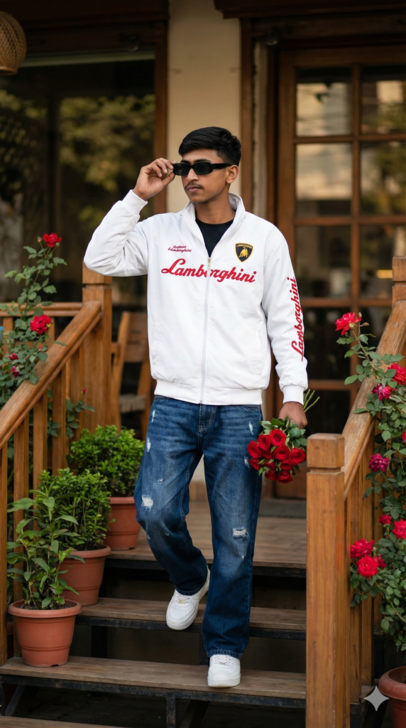 Prompt: Ultra-realistic full-body cinematic photograph of a stylish young man walking down outdoor cafe steps. He is wearing a white Lamborghini zip-up jacket with red text logo on the chest and sleeves, black inner t-shirt, dark blue loose-fit jeans with distressed patches, and clean white sneakers, a man looking slightly left side. Accessories: black rectangular sunglasses, a rose bouquet in the right hand. Pose: confidently stepping down stairs, left hand adjusting sunglasses, natural walking motion. Face: same to same face as reference image, realistic skin texture, sharp jawline, same hairstyle. Background: aesthetic café entrance with green plants in pots on both sides and flowering red rose plants, wooden railings, warm ambient daylight. Lighting: soft natural daylight, cinematic color grading. Style: hyper-realistic, Instagram fashion photography, 8K quality. Aspect Ratio Strictly 9:16 vertical.