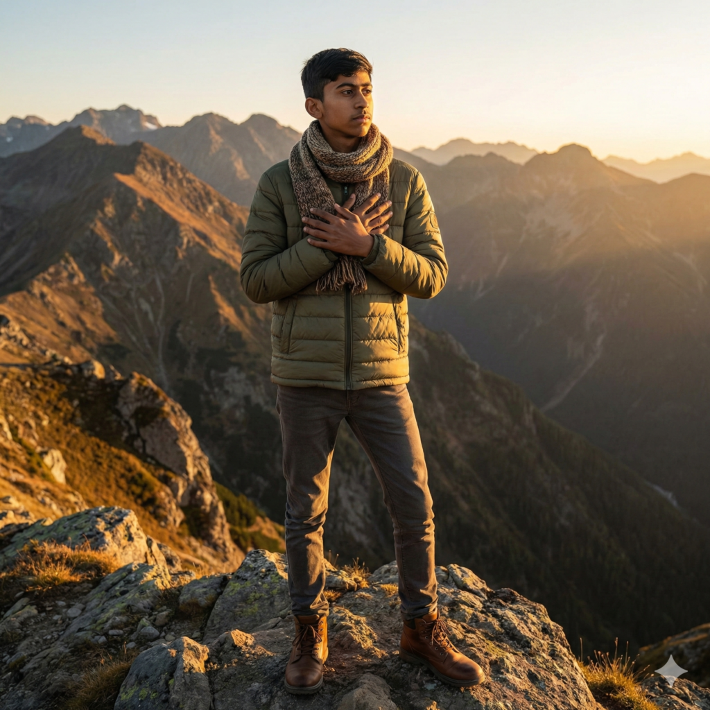 Prompt: Create an advanced 4K HD editorial fashion photo of a young boy using the exact face from the uploaded photo—do not change the face, keep 100% original facial features, skin tone, and expression—wearing a padded jacket with a scarf, fitted trousers, and boots, standing on a mountain edge with hands crossed lightly, looking away thoughtfully, golden-hour sunlight creating cinematic depth, ultra-realistic textures, luxury adventure style.
