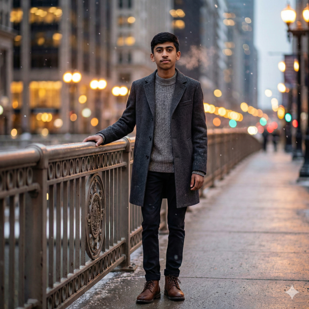 Prompt: Create an advanced hyper-realistic editorial photo of a young boy using the exact face from the uploaded photo—do not change the face, keep 100% original facial features, skin tone, and expression—wearing a tailored coat over a knit sweater with trousers and boots, standing on a city bridge with one hand lightly touching railing, confident editorial gaze, soft warm lights creating cinematic bokeh, ultra-realistic textures, high-end winter fashion narrative.