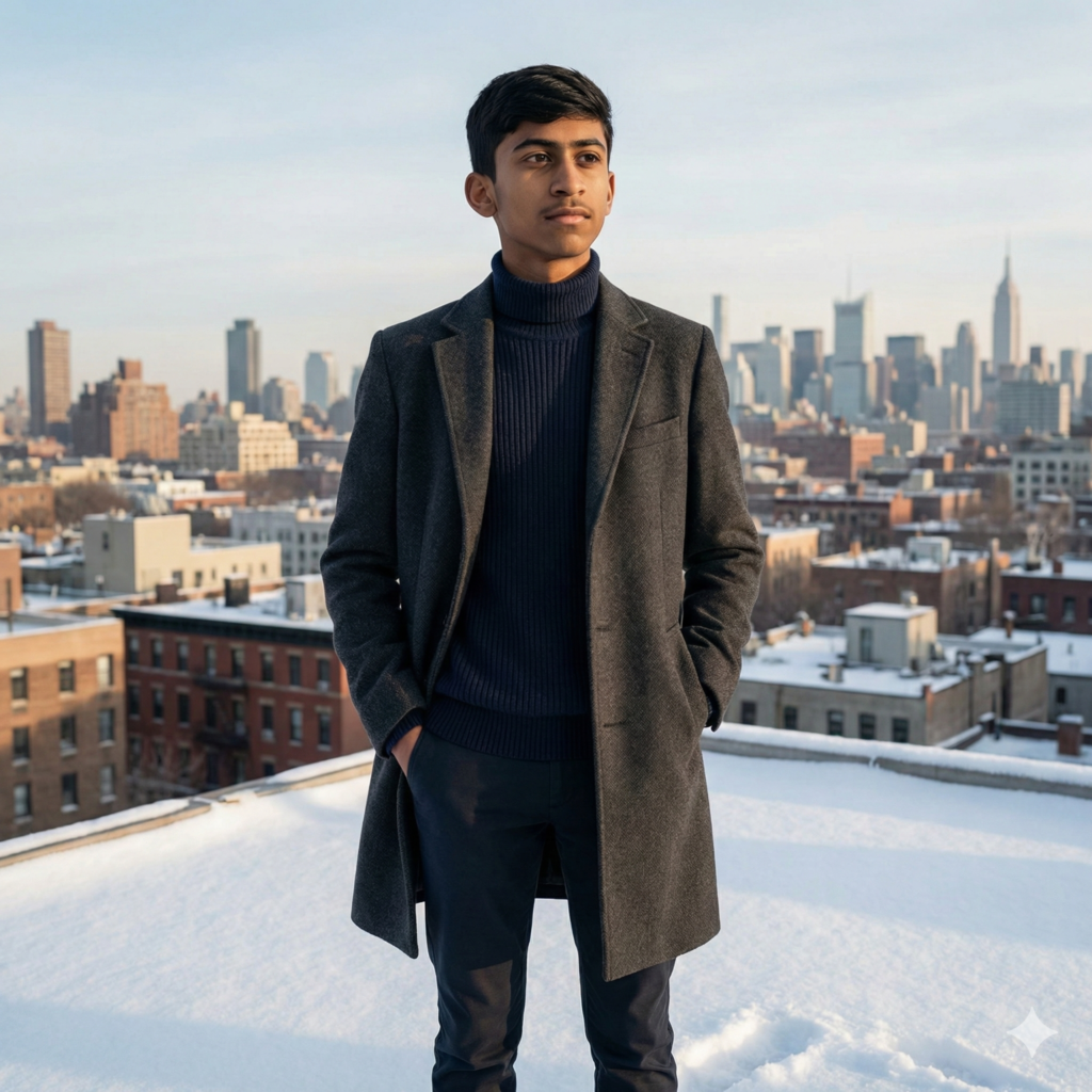 Prompt: Generate an ultra-realistic 8K editorial fashion portrait of a young boy using the exact face from the uploaded photo—do not change the face, keep 100% original facial features, skin tone, and expression—wearing a tailored wool coat layered over a fitted turtleneck sweater and slim trousers, standing on a snowy rooftop with hands in pockets, looking confidently at the skyline, soft diffused winter sunlight, cinematic shadows, hyper-detailed textures, luxury lifestyle aesthetic, Vogue-style photography.