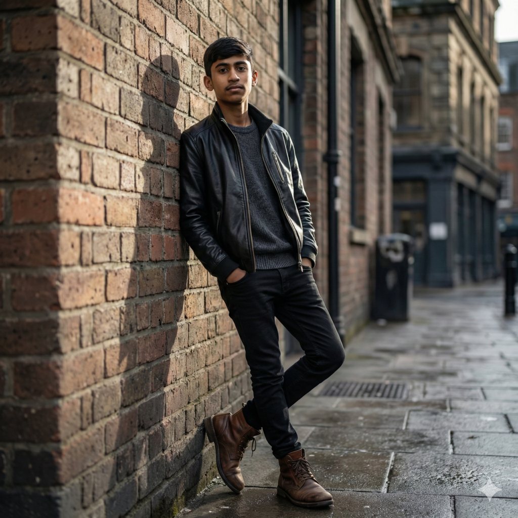 Prompt: Produce a hyper-detailed realistic editorial portrait of a young boy using the exact face from the uploaded photo—do not change the face, keep 100% original facial features, skin tone, and expression—wearing a leather jacket layered with a sweater, slim black jeans, and boots, leaning against a wall with hands relaxed, confident street-style expression, soft winter light with cinematic shadows, ultra-realistic skin, urban fashion aesthetic.