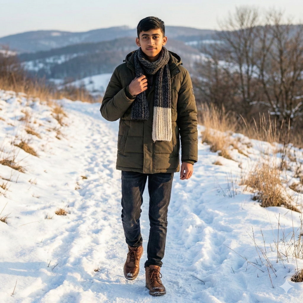 Prompt: Produce an advanced ultra-realistic editorial photo of a young boy using the exact face from the uploaded photo—do not change the face, keep 100% original facial features, skin tone, and expression—wearing a padded winter jacket, scarf, and leather boots, walking along a snow-covered hill path with one hand adjusting scarf, casual confident gaze, natural winter sunlight with cinematic shadows, hyper-detailed snow textures, luxury outdoor fashion aesthetic.