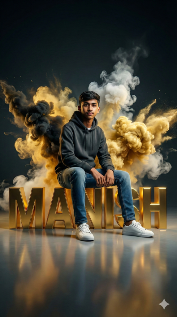 Copy-Paste Prompt: “A cinematic, hyper-realistic portrait of a young man (100% matched the face reference) sitting casually on large 3D golden letters spelling ‘MANISH.’ He wears a dark hoodie, blue jeans, and white sneakers. Behind him, dramatic golden, black, and white smoke bursts outward against a dark backdrop. Ultra-detailed, 8K quality, with cinematic lighting, subtle reflections on the floor, and a bold, modern, and powerful atmosphere. Aspect Ratio Strictly 9:16 Vertical.”