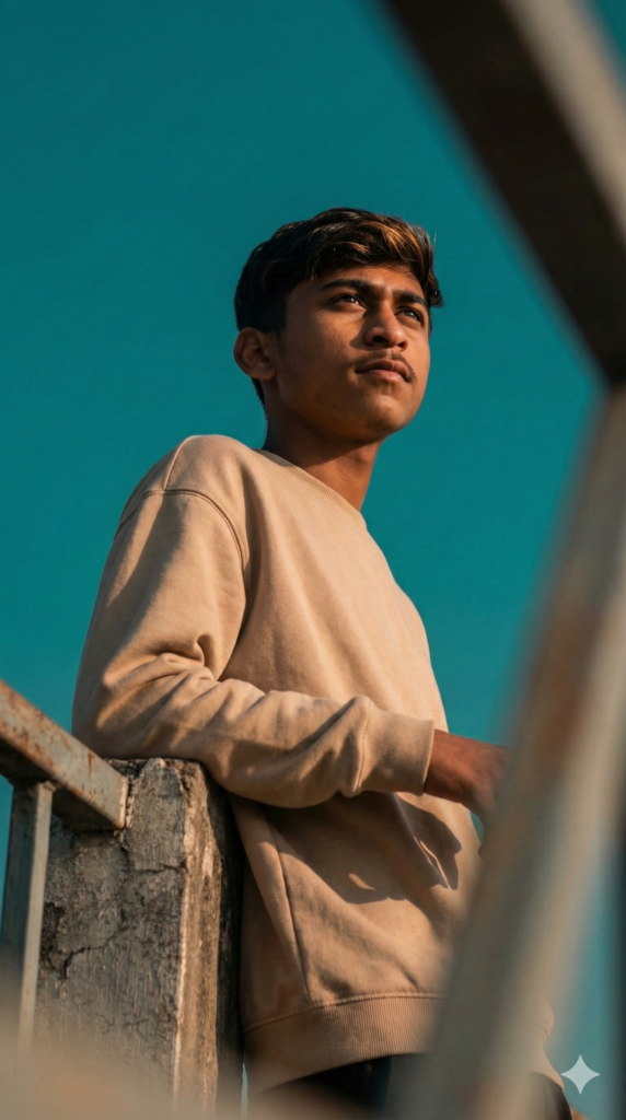 Copy-Paste Prompt: “A cinematic low-angle portrait shot captured with a 50mm lens, looking up at a male subject featuring the uploaded face as reference, is leaning casually against a weathered concrete and metal railing with both elbows resting. The subject has the same hairstyle with sun-kissed highlights and is wearing an 3 oversized, textured beige long-sleeve crewneck sweatshirt that drapes loosely. He is gazing upward and to the right with a contemplative expression, bathed in soft, warm natural sunlight that creates gentle shadows under the jawline and accentuates the skin’s subsurface scattering. The composition includes a significant foreground blur (bokeh) of a structural element on the right side, adding depth and framing the subject. The background is a vast, solid expanse of deep teal-cyan sky, creating a striking teal and orange color grade typical of analog film photography. Aspect Ratio Strictly 9:16 Vertical.”