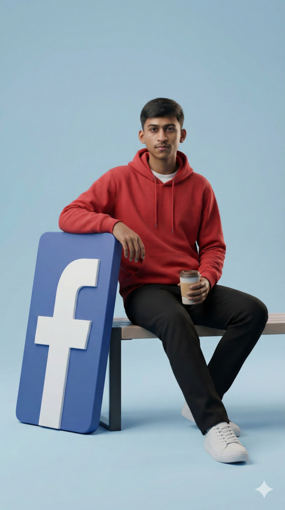 Copy-Paste Prompt: “A hyper-realistic full-body portrait of an uploaded image. Their pose is ‘sitting’. Beside them stands a vertical oversized Facebook icon, placed firmly on the ground, slightly tilted for a stylish aesthetic. The object is approximately at arm-height, allowing them to casually lean one arm on it for support. On the other hand, they hold a ‘cup’. Use a full-frame DSLR camera simulation, crisp image with shallow depth of field. Background: Minimal pastel blue studio with soft cinematic lighting that wraps naturally around the face and shoulders, casting delicate shadows and depth. Ultra-detailed textures on clothing, skin, hair, and object surfaces. The subject wears a red streetwear hoodie, black trousers, and white shoes. Rendering style: Clean, minimal, modern, and visually striking must look like a professional fashion photo, not CGI. Aspect Ratio Strictly 9:16 Vertical”