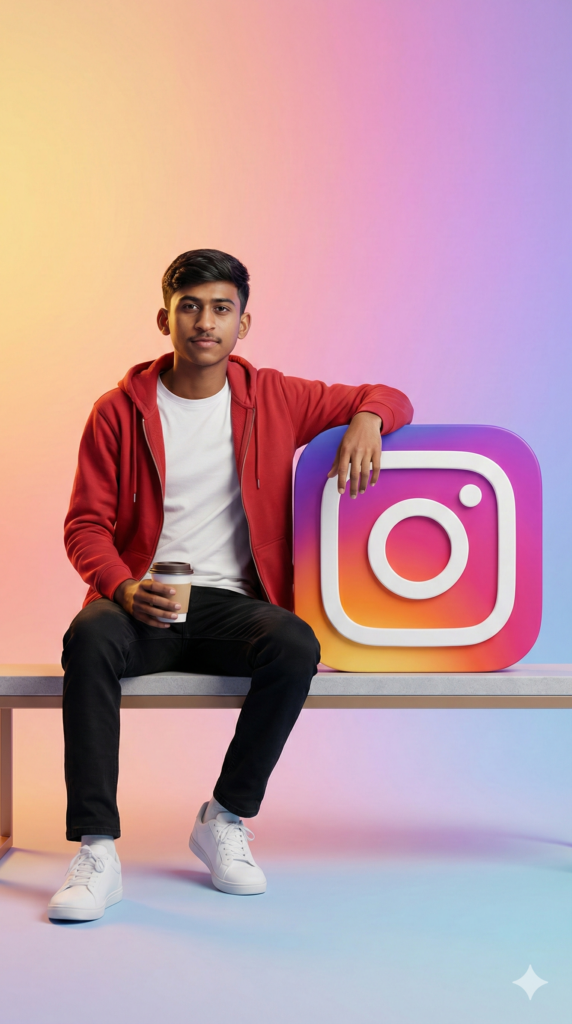 Copy-Paste Prompt: “A hyper-realistic full-body portrait of the uploaded image, seated confidently beside a vertical oversized Instagram logo, tilted slightly for composition. They rest one arm casually atop it while holding a cup in the other. Captured in full-frame DSLR realism, crisp focus, creamy bokeh, and soft cinematic light. Background: minimal warm pastel multi-color gradient transitioning from yellow to orange, pink, purple, and blue studio, with lighting wrapping gently around face and shoulders, creating depth. Outfit: red zip hoodie, black jeans, and white sneakers-clean and relatable. Rendering style: modern, cinematic, minimal like a promotional fashion photo from a creator brand shoot. Aspect Ratio Strictly 9:16 Vertical”