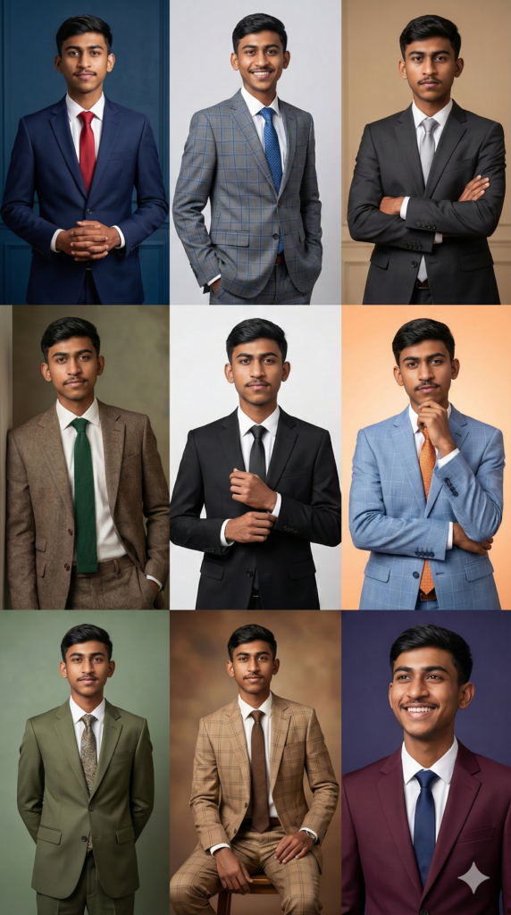 Copy-Paste Prompt: “Create 9 ultra-realistic 8K portraits of the same man using the uploaded photo exactly (100% identical facial identity). Arrange them in a 3×3 grid (portrait ratio) with each image showing him in a different color suit and tie (mix of solid and checked). Each scene should feature a unique pose, gesture, and background color tone. Aspect Ratio Strictly 9:16 Vertical”