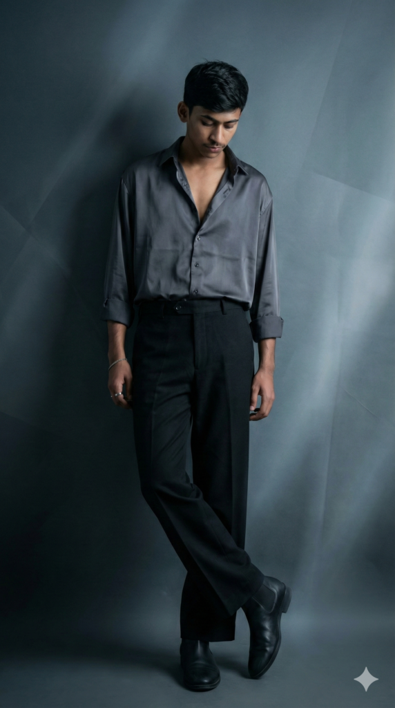 Copy-Paste Prompt: “A male model with the same hairstyle and a calm, magnetic aura stands in a cinematic, moody studio scene. His pose is effortlessly elegant – one leg slightly crossed, back leaning subtly against a textured wall, hands relaxed yet confident. His gaze drifts downward, exuding quiet intensity and introspective depth. The background features a deep charcoal-to-ash gradient with faint geometric textures and soft matte reflections, creating refined artistic depth within a minimalist setting. Subtle diffused light streaks enhance the moody, editorial atmosphere. He wears an oversized charcoal-gray silk shirt with a soft sheen, casually unbuttoned at the top and rolled to the forearms, the fluid fabric catching the side light beautifully. It’s tucked into high-waisted, wide-leg black wool trousers that drape with effortless sophistication. On his feet are matte black leather Chelsea boots – sleek, minimal, and perfectly balancing the ensemble. A slim silver ring and subtle wrist chain add understated elegance and contrast. The lighting is soft and directional, casting cool cinematic tones and gentle shadows that highlight each texture and contour. The entire composition radiates refined confidence, quiet strength, and timeless modern masculinity captured in 9:16 aspect ratio, 4K resolution, using the face reference from the uploaded picture.”