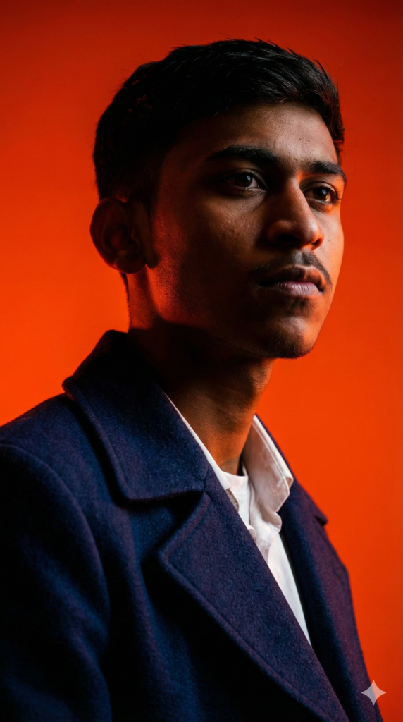 Copy-Paste Prompt: “A powerful editorial, highly detailed, photorealistic, dynamic low-angle portrait features a handsome man against a vibrant, solid orange-red background, utilizing dramatic, high-contrast studio lighting dominated by vibrant orange and deep red hues. The man maintains a serious, intense expression while looking into the space above. He is wearing a dark blue coat and a white shirt underneath. Directional lighting casts deep shadows, adding to the mysterious and intense mood, while a strong dramatic rim light or color cast highlights his edges, separating him from the intensely lit background. The composition is a low-angle medium close-up, focusing on his face and shoulders, rendered sharply against the smooth, intense color gradients of the cinematic backdrop. Aspect Ratio 9:16”