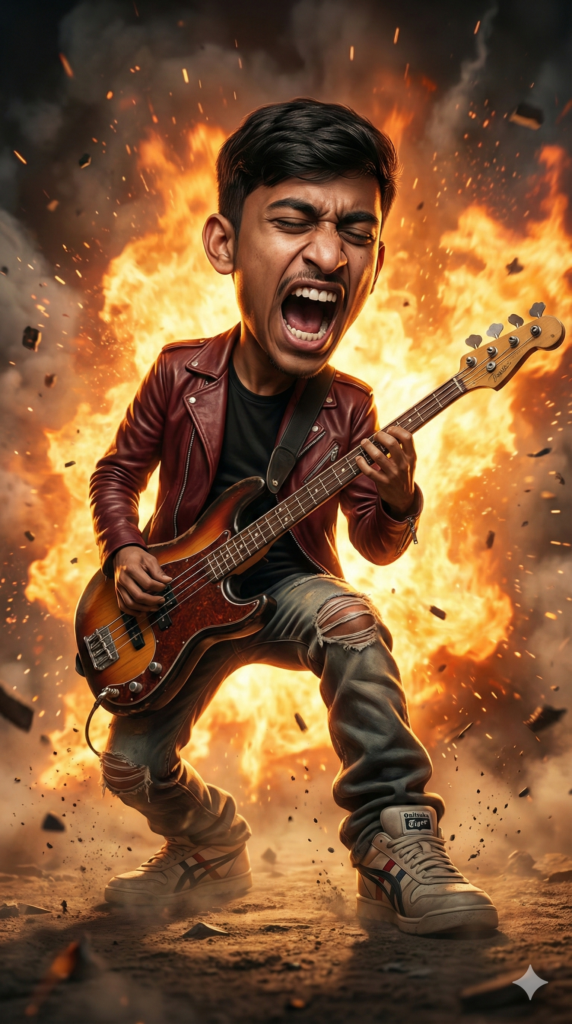 Copy-Paste Prompt: “Ultra-realistic cinematic action caricature portrait based strictly on the photo reference. Preserve the original face, expression, bone structure, and identity with 99% likeness accuracy, no facial alteration. Depict a male rock musician mid-performance, screaming with eyes tightly closed, mouth wide open, conveying raw power and intensity. Apply refined modern caricature proportions to all subjects: oversized expressive head (15-20%), compact torso, short stylized legs. Maintain realistic anatomy and a dynamic, energetic pose that 2 follows the original body posture, one knee bent forward while aggressively gripping a vintage wooden electric bass guitar with clear strings and tuning pegs. Outfit follows the reference: dark red leather jacket, black t-shirt, ripped jeans with voluminous fabric, and oversized rounded Onitsuka Tiger sneakers, with bulky creases. The environment features a massive fiery explosion behind the subject with bright orange flames, sparks, smoke, flying debris, and rising dust. Strong cinematic lighting with warm fire backlight, subtle rim light, deep frontal shadows, dramatic contrast, shallow depth of field. Style fusion inspired by Jason Seiler, Sebastian Krüger, and polished modern caricature aesthetics, blockbuster movie-poster mood, ultra-detailed, hyper-realistic finish, professional cinematic photography. Aspect Ratio Strictly 9:16 Vertical.”