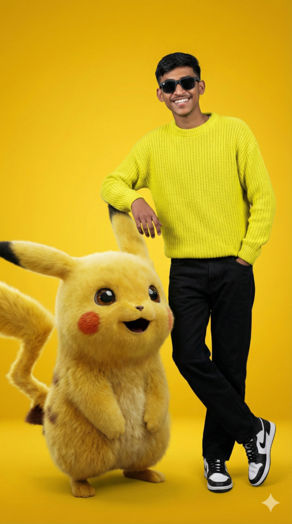 Copy-Paste Prompt: “Hyper-realistic photorealistic image with absolute preservation of the original face, no stylization or alteration. A confident man wearing matte black luxury sunglasses, an electric yellow knitted sweater with rich knit texture, black high-waisted jeans with clean structure, and white and black high-top sneakers. He stands casually with one arm resting on a giant 3D photorealistic Pikachu, rendered with realistic fur texture and soft lighting. Pikachu smiling up at him with an energetic, cheerful presence. The man’s expression is lively and upbeat, matching the playful interaction. Sunglasses are clearly visible and integrated naturally into the look, catching subtle studio reflections. The background is a vibrant yellow studio backdrop with smooth gradients and depth. creating a bold, joyful, high-end editorial finish with sharp focus and natural color balance. Aspect Ratio Strictly 9:16 Vertical.”