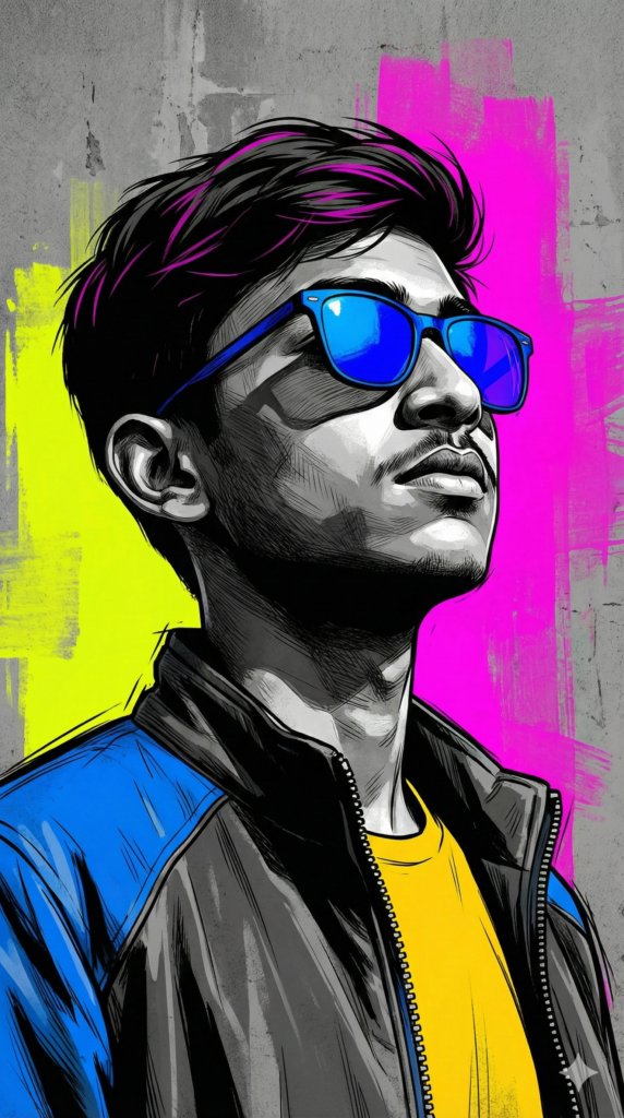 Copy-Paste Prompt: “A hyper-realistic 8k portrait, captured with a slightly low-angle medium close-up shot, focuses on the upper torso and head of a person looking upward and to the right, against a vibrant, stylized background. The composition features the subject slightly off-center, creating a dynamic and engaging visual. The lighting is high-contrast and dramatic, utilizing cinematic chiaroscuro to define strong shadows and highlights across the grayscale areas of the subject’s skin and clothing, suggesting a powerful directional light source from the upper left. The subject has the same hairstyle with bold black outlines and subtle magenta streaks on the left side, and wears stylish sunglasses with reflective electric blue lenses and light-colored frames. They are dressed in a bright yellow t-shirt layered under an open jacket, which features a prominent blue section on the left shoulder/sleeve and a dark gray/black main body with a highly detailed zipper. The background is a distressed, grunge-textured gray wall, heavily adorned with large, abstract blocks of neon yellow on the left and vibrant magenta on the right, giving the impression of street art or graffiti. These colored blocks have a painterly, brushstroke texture, contrasting with the fine cross-hatching and parallel lines used for shading on the grayscale elements. The overall aesthetic is a graphic novel style with strong black outlines, highly detailed textures, and a limited yet impactful color palette. For the character’s facial features, please use uploaded face as reference. Aspect Ratio Strictly 9:16 Vertical.”